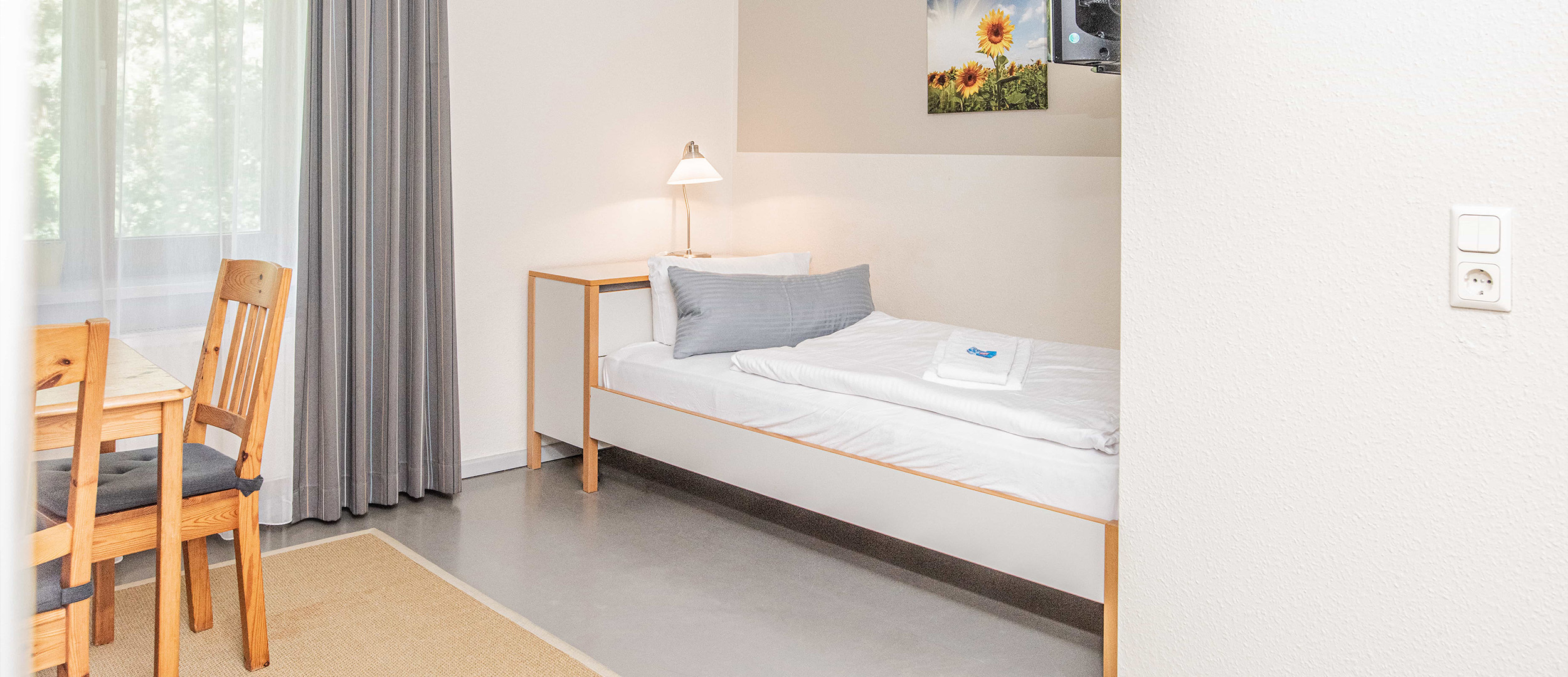 Im geräumigen, auf eine Person zugeschnittenen Wohn- und Schlafbereich befindet sich eine gut ausgestattete Küche mit Esstisch, ein zum Zusatzbett wandelbares Sofa, ein 90 cm breites Bett, ein Flachbild-TV und ein geräumiger Schrank für Ihre Urlaubsgarderobe. Zusätzlich kann ein Kinderbett als Zusatzleistung gebucht werden.